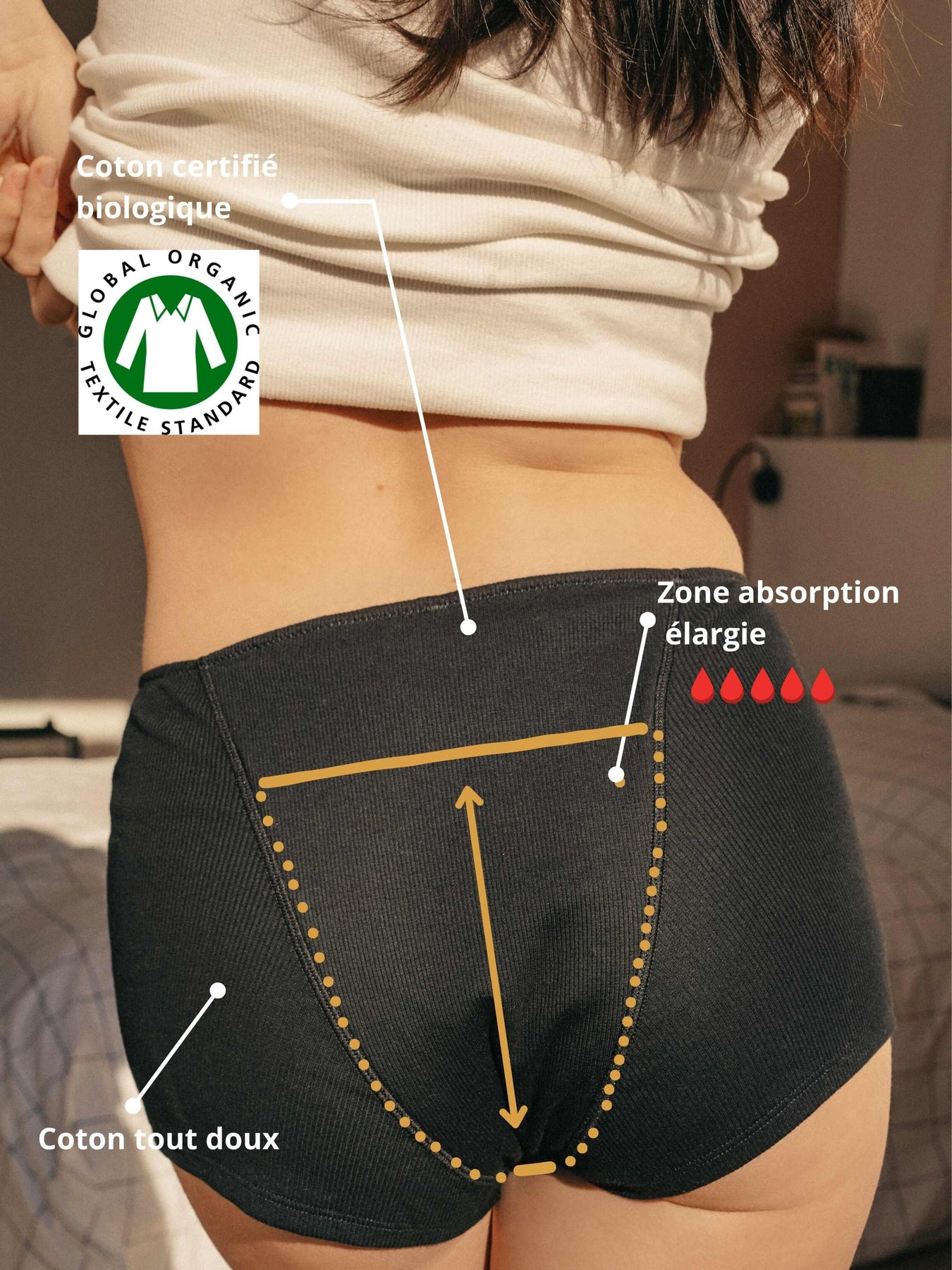 Super absorbent : Period boxer shorts with a dense, high-performance absorbent, wide at the crotch (9cm) and good coverage on the buttocks, it is guaranteed to be leak-free even on days or nights of very heavy flow with optimal comfort.